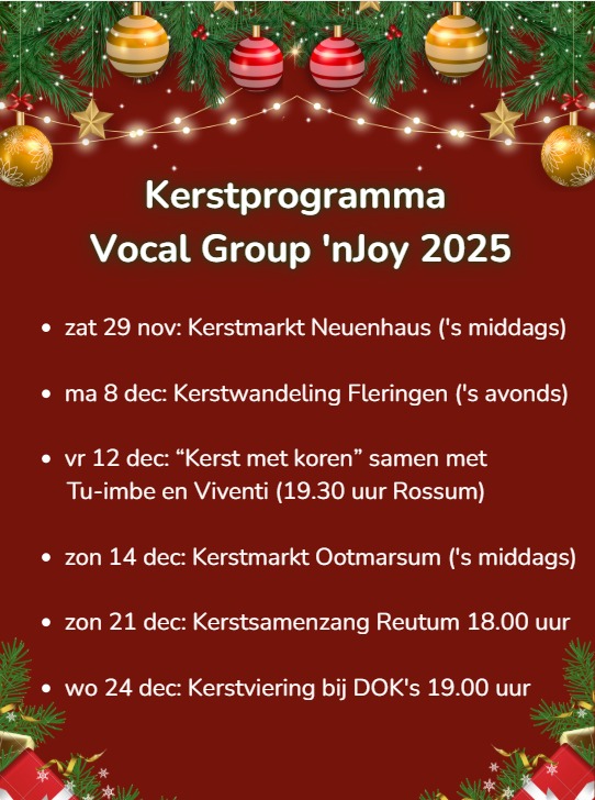 De dagen worden korter, de lichtjes gaan aan… en dat betekent dat de gezellige kerstperiode er weer aankomt! Ook dit jaar is Vocal Group ’nJoy in de decembermaand op verschillende plekken te horen met sfeervolle kerstoptredens.